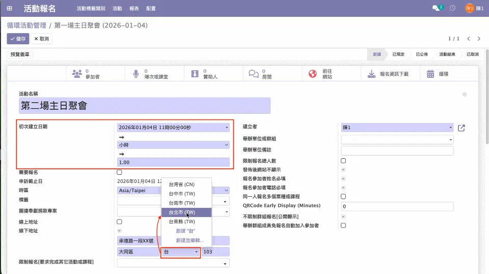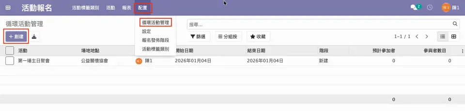 進入到循環活動管理頁面後,輸入該循環活動「初次建立日期」及相關活動設定。