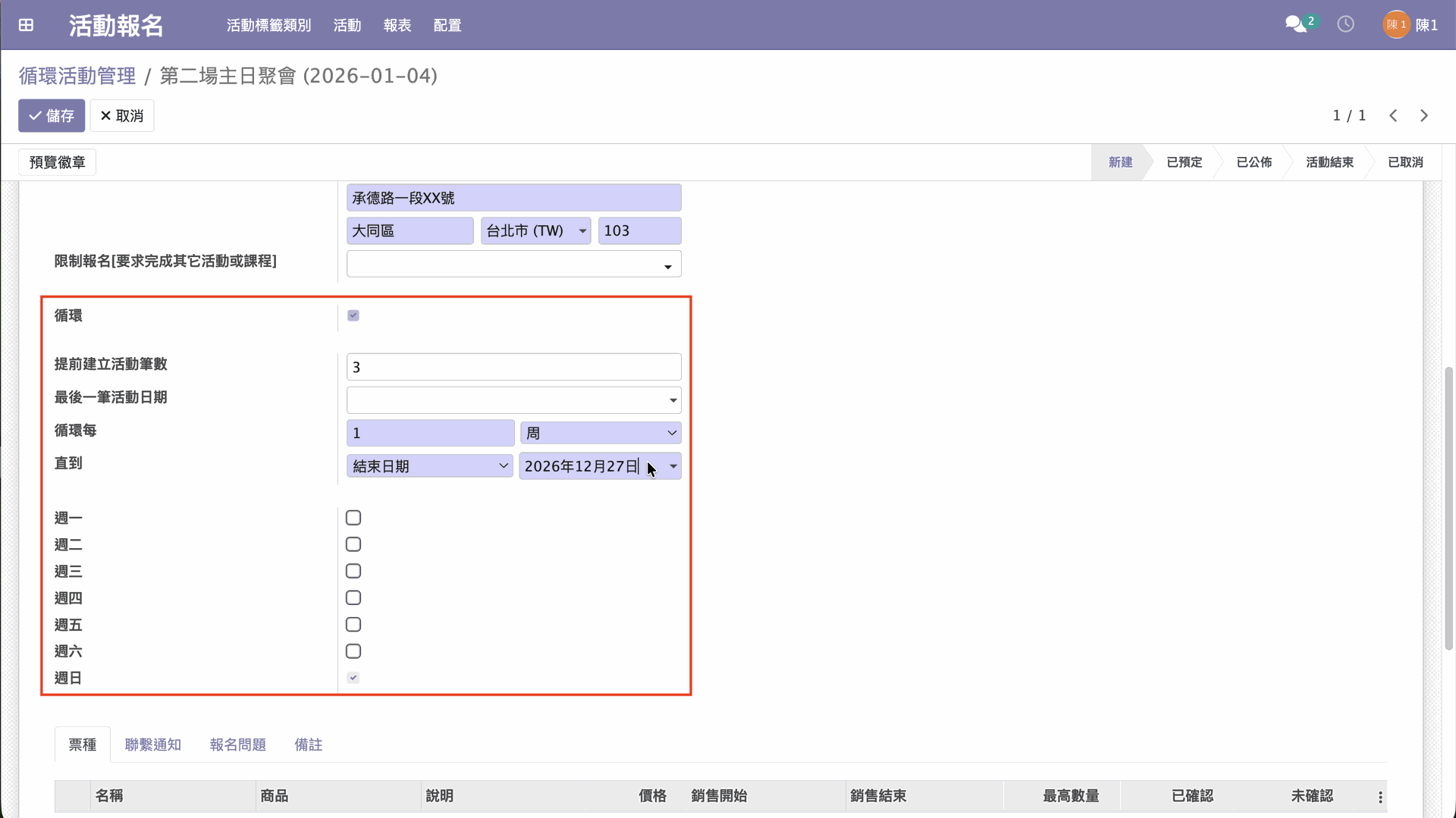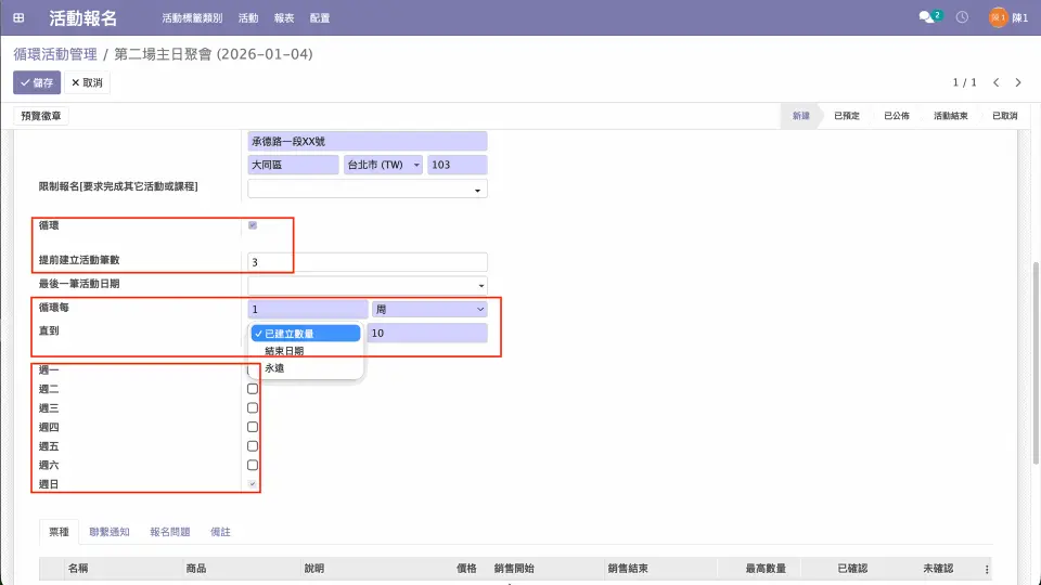 提醒:不要設定「最後一筆活動日期」欄位。在觸發系統自動建立循環活動時,系統自動填入最後一筆活動日期。