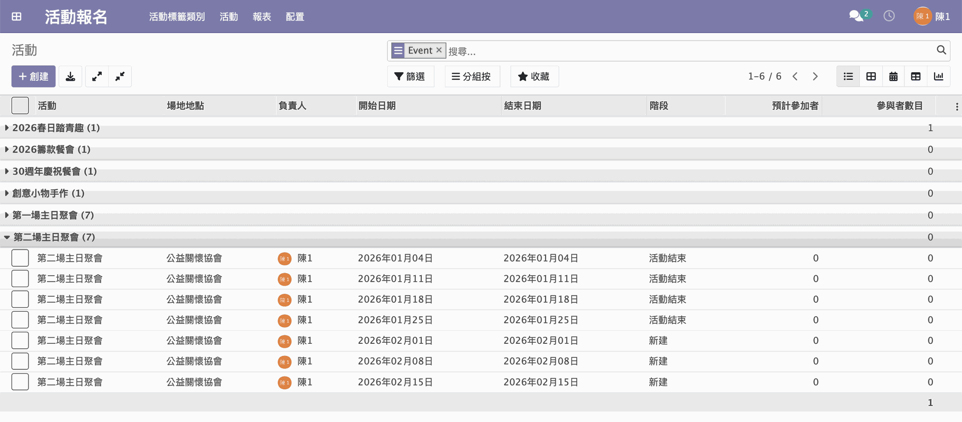 範例:創建「第二場主日聚會」之循環活動,設定循環週期為每週週日,提前建立 3 筆活動,並將循環期限設定至 2026/12/27。